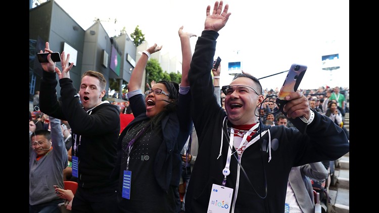 Attendees cheer before the start of the Google I/O 2018 Conference.
